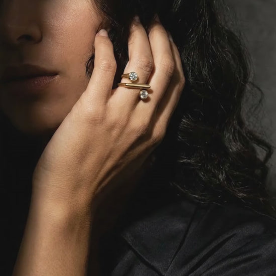 Add contemporary elegance to your jewellery collection with this beautifully crafted gold-plated open wrap ring. Designed with a sleek curved band and sparkling crystal accents on both ends, this ring blends minimal sophistication with modern charm.